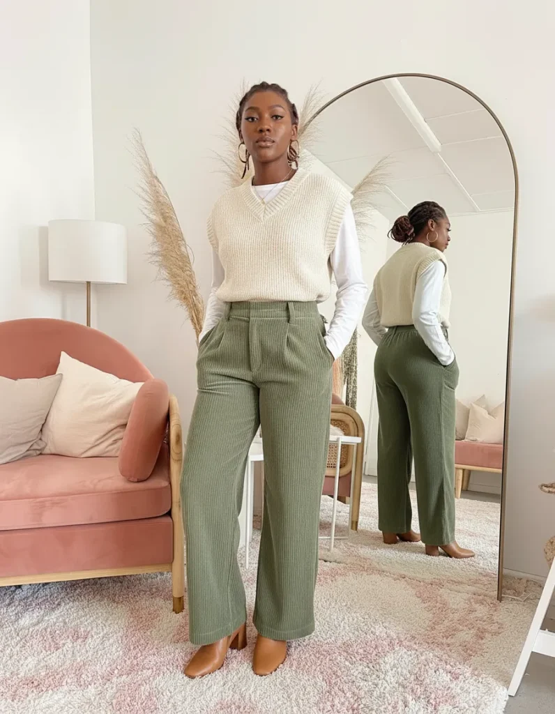 - Why It Works: Corduroy adds great texture and a nostalgic, cozy vibe, while the blouse elevates the look.