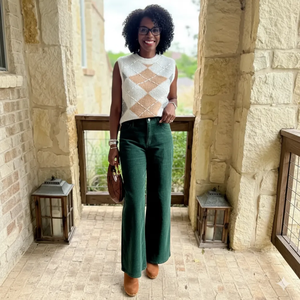 - The Look & Feel: Wide-wale or fine-wale corduroy pants (straight leg, wide leg, or even a comfortable skinny fit) in an autumnal color like rust, olive, or cream, paired with a silky or cotton blend blouse.