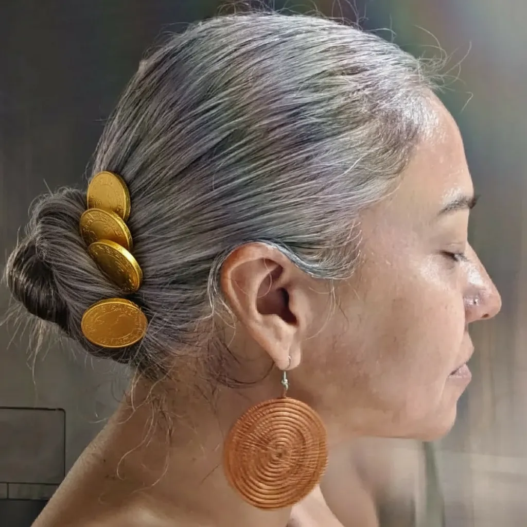 Okay, how CUTE is this? It’s a sophisticated low bun, nestled at the nape of your neck, but with a playful twist: little gold coin hairpins! It’s a super stylish nod to a fun tradition.