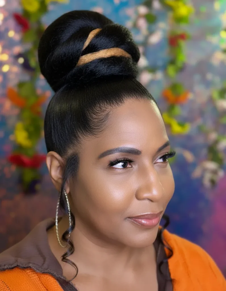 Ask for a “sleek, twisted high top knot” and emphasize you want a “polished, flyaway-free finish.”