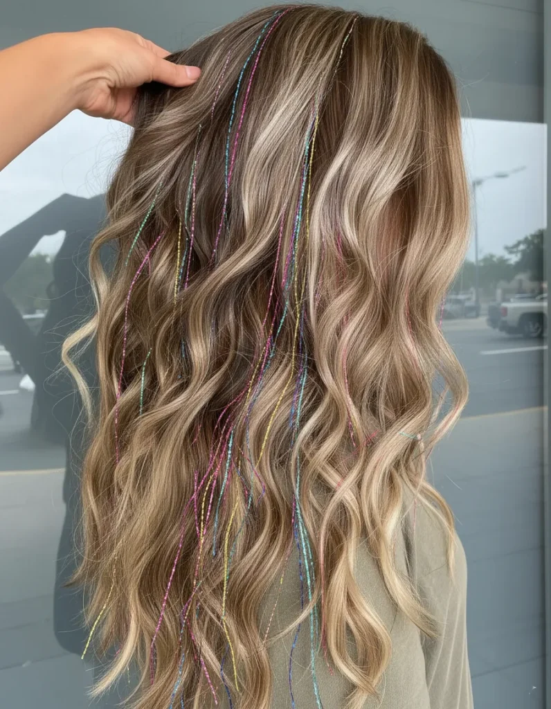 Let’s add some magic! We’re talking about individual strands of shimmery hair tinsel in silver, gold, or blue, tied right into your hair. It creates the most beautiful, subtle sparkle every time you move.