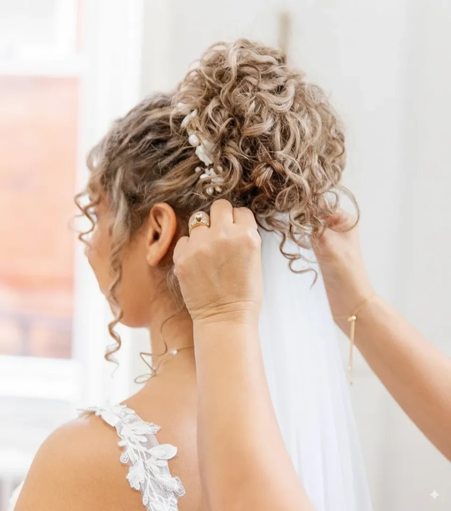 Ask for a “voluminous curly updo that celebrates my natural texture” and mention you want “pearl pins scattered throughout.”