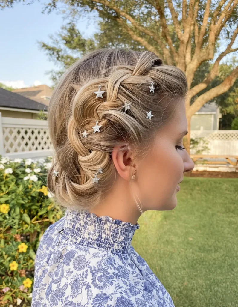 Calling all queens! This is a stunning Dutch or French braid wrapped around your head like a celestial halo, with tiny, sparkling star pins dotted throughout. It’s a literal dream.