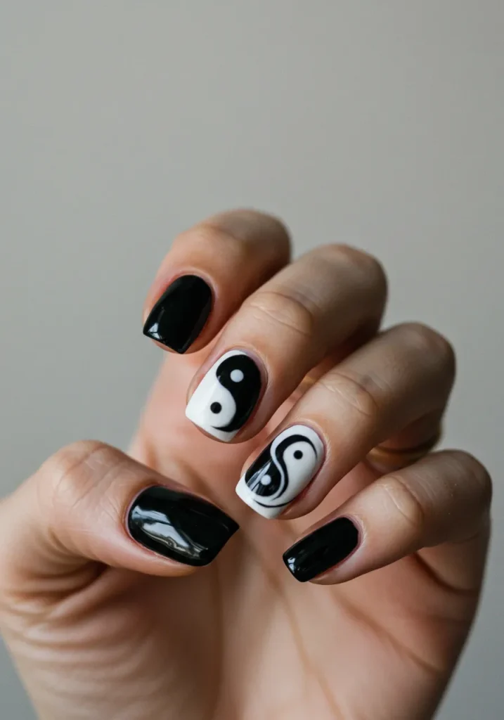 Request a “Yin and Yang accent nail.” Be specific about who gets which half. The other nails should be a solid, unifying color. Black, white, or a clean nude.