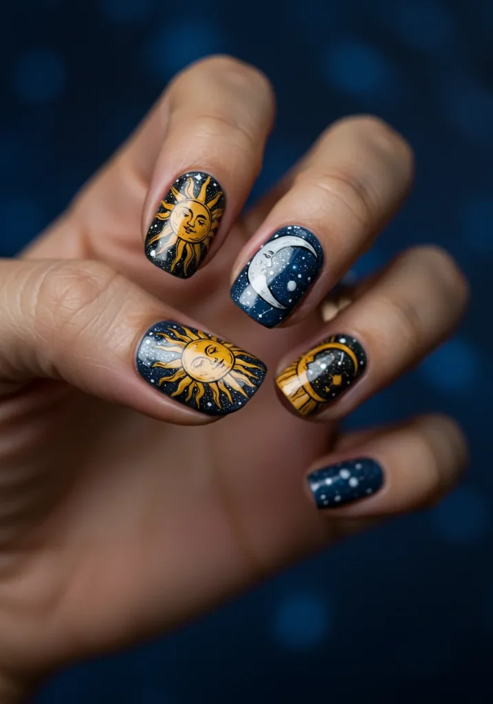 Ask for a “fine line sun and moon design.” Specify one for each of you. A dark navy or sheer nude base makes the metallic art stand out. The key is “fine line.” You want it to look like an illustration.