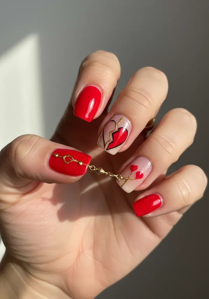 Ask for a “split heart design on the pinky nails.” Confirm with the tech that they will paint a mirror image on each hand. Otherwise, they will not line up.