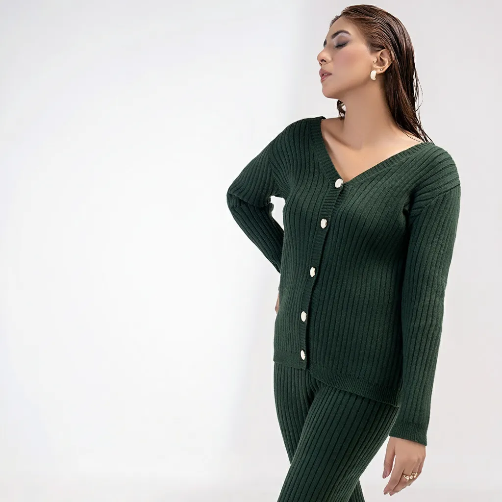 - The Look: A matching ribbed knit sweater and a midi skirt or wide-leg trousers in the same color and fabric.