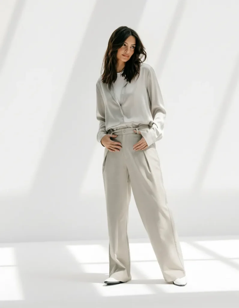 - Key Pieces: A 100% silk blouse in ivory or champagne, and charcoal grey or black high-waisted wool trousers.