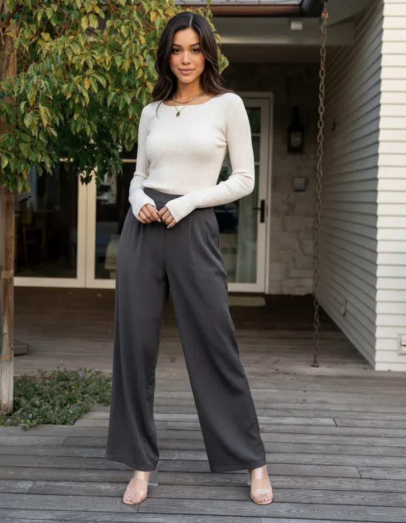 - The Look: High-waisted, fluid wide-leg trousers with a fine-gauge knit sweater neatly tucked in to highlight the waist.