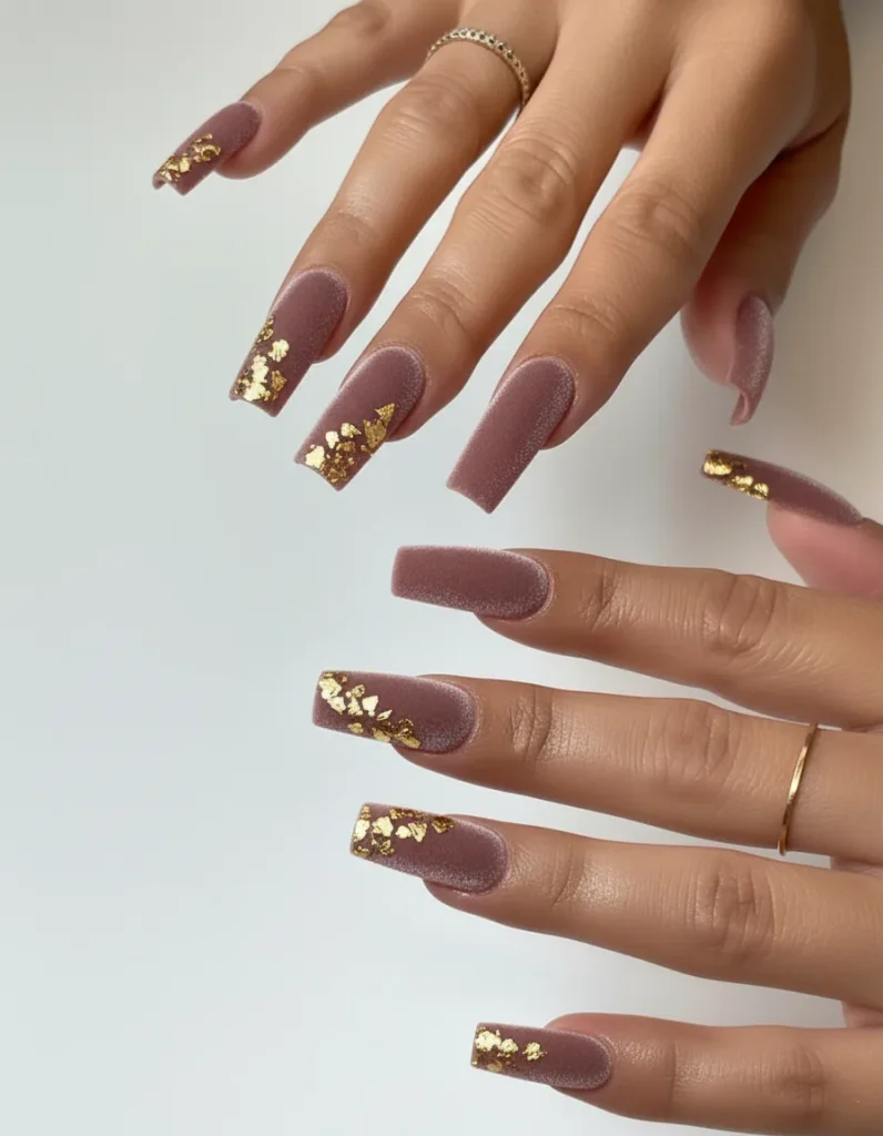 A solid base color with flakes of gold foil pressed onto one or two accent nails. The strategy is to add glamour that feels artistic and deconstructed, not perfect.