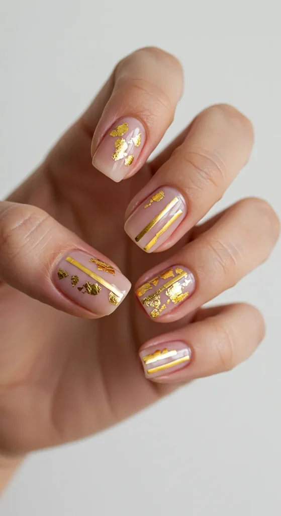 Ask for a “nude manicure with a single piece of gold foil.” Tell them exactly where you want it. Near the cuticle or off to the side.