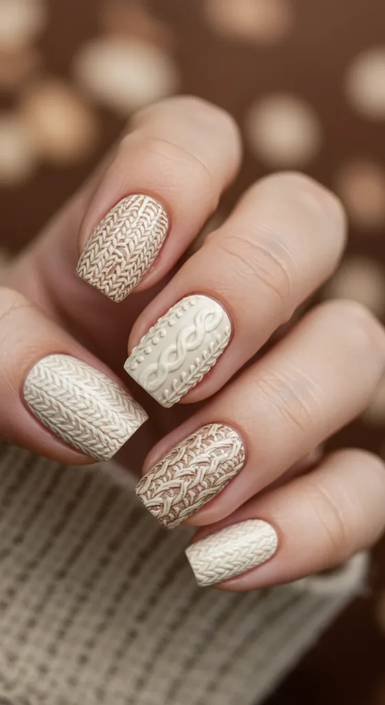 This is a specific salon technique. Ask for “3D sweater-knit nail art.” It’s done with gel polish or acrylic powder.