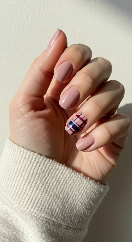 Request a “plaid accent nail,” usually on the ring finger. Bring a picture of the color palette you want. For example, a “gray and cream plaid.”