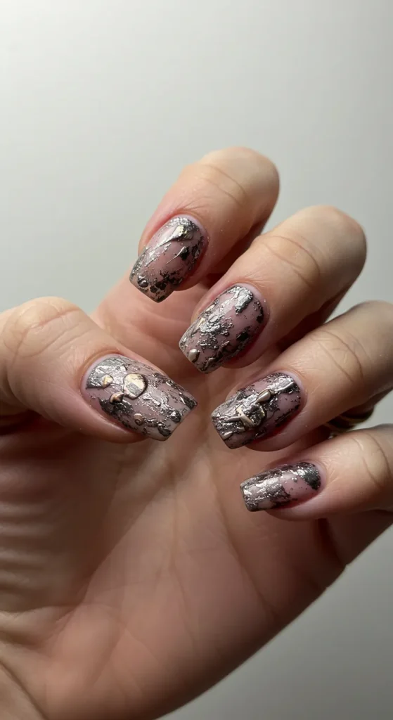 You can do this at home. Buy sheets of nail foil. Use tweezers to place a tiny piece onto a still-wet top coat.