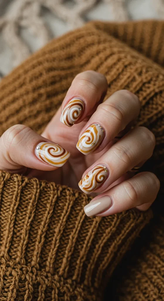 Ask for “latte art swirls” or “coffee-inspired abstract nails.” Be clear about the color palette: cream, caramel, and espresso.