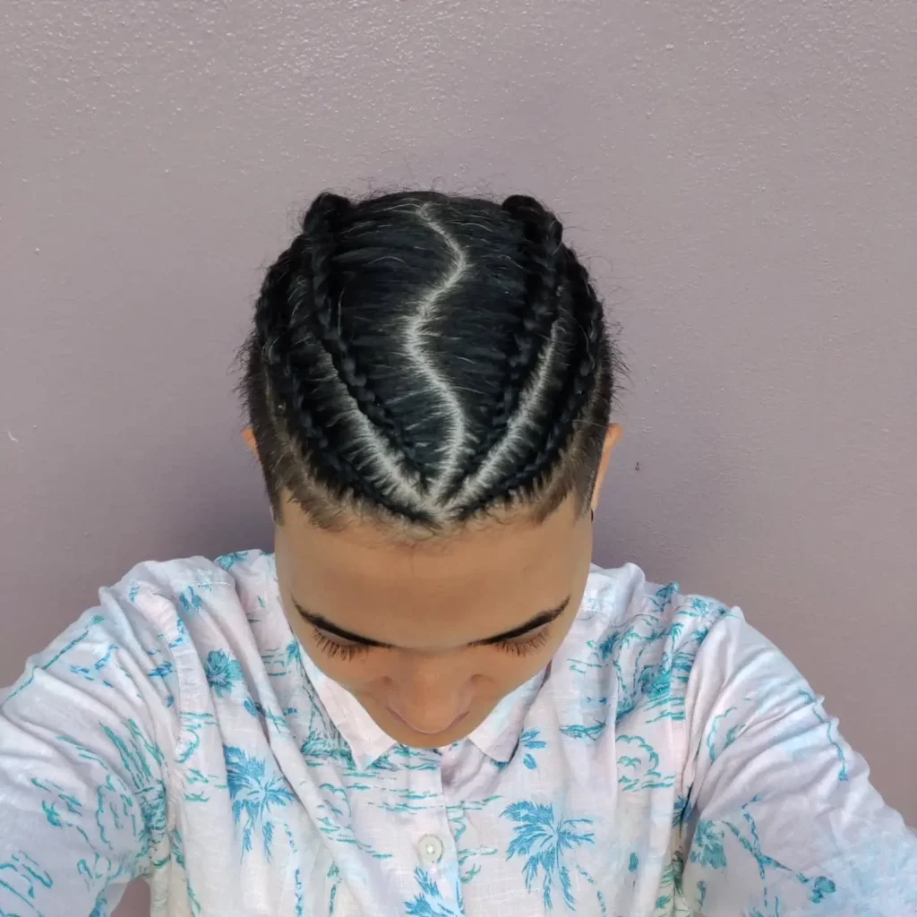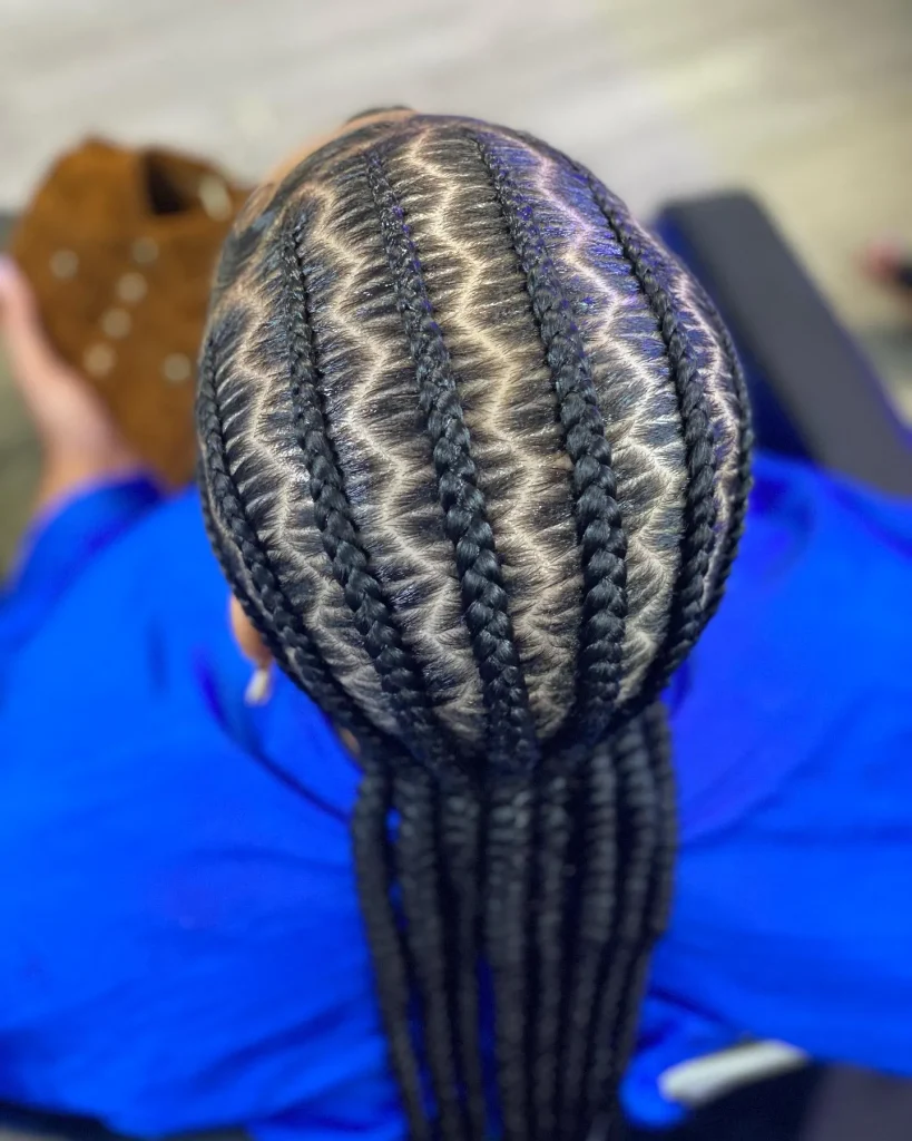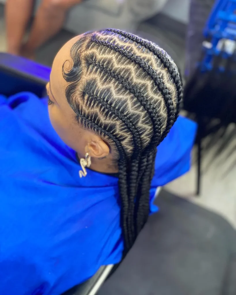 Zig-zag cornrows take the classic all-back style to a new level. This bold and creative design adds movement and texture to the hair, making it a fun choice for anyone wanting something a bit more intricate.