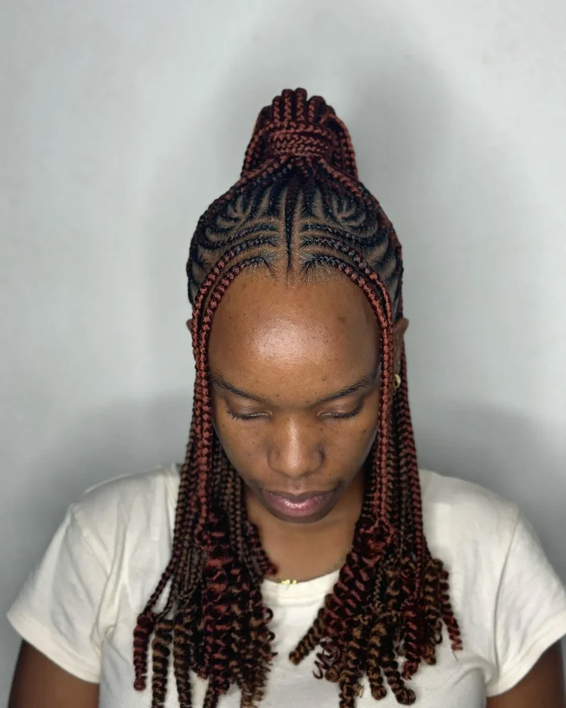 An all-back cornrow updo combines elegance with functionality. Gather your cornrows into an updo for a polished look that keeps hair off your face and neck, ideal for both professional and casual occasions.