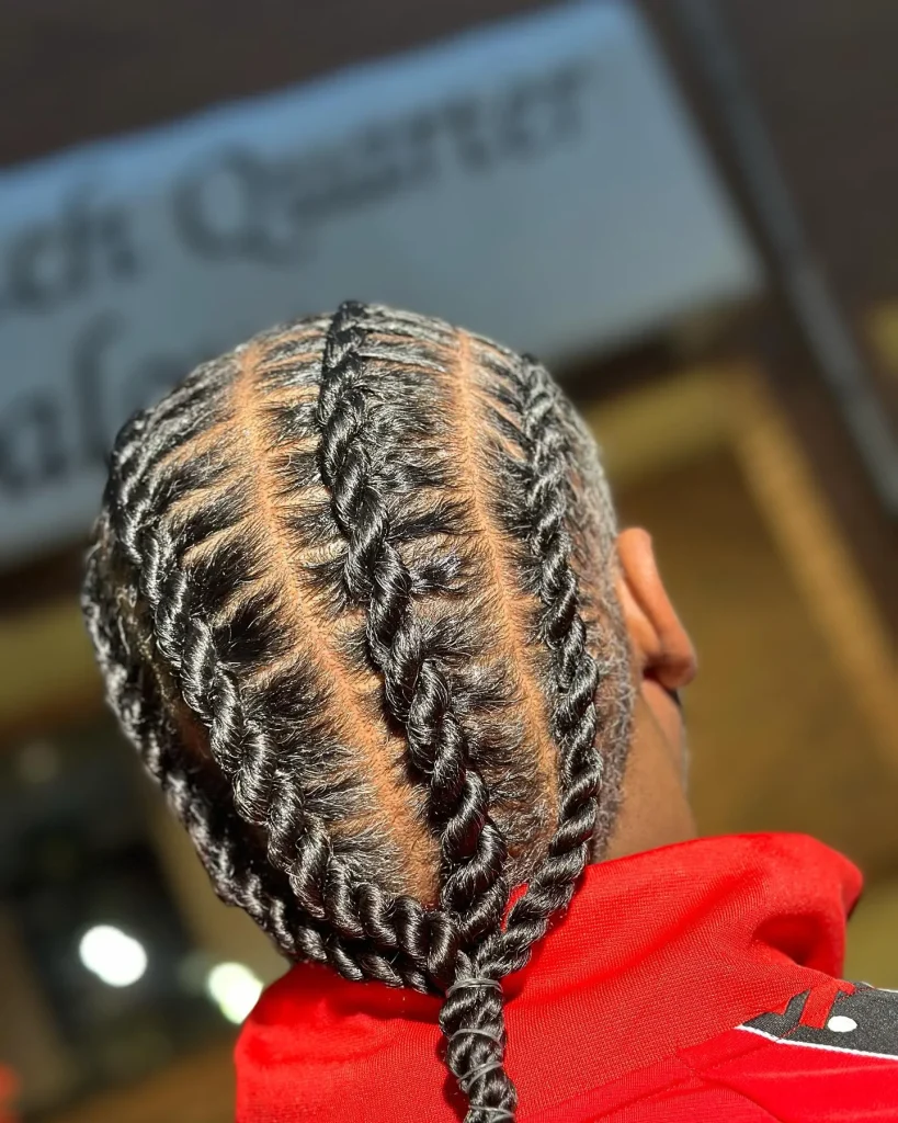 Double braids in the all-back style create a bold, striking look. Two sections of cornrows are braided separately, and then pulled back to form a clean, symmetrical style.
