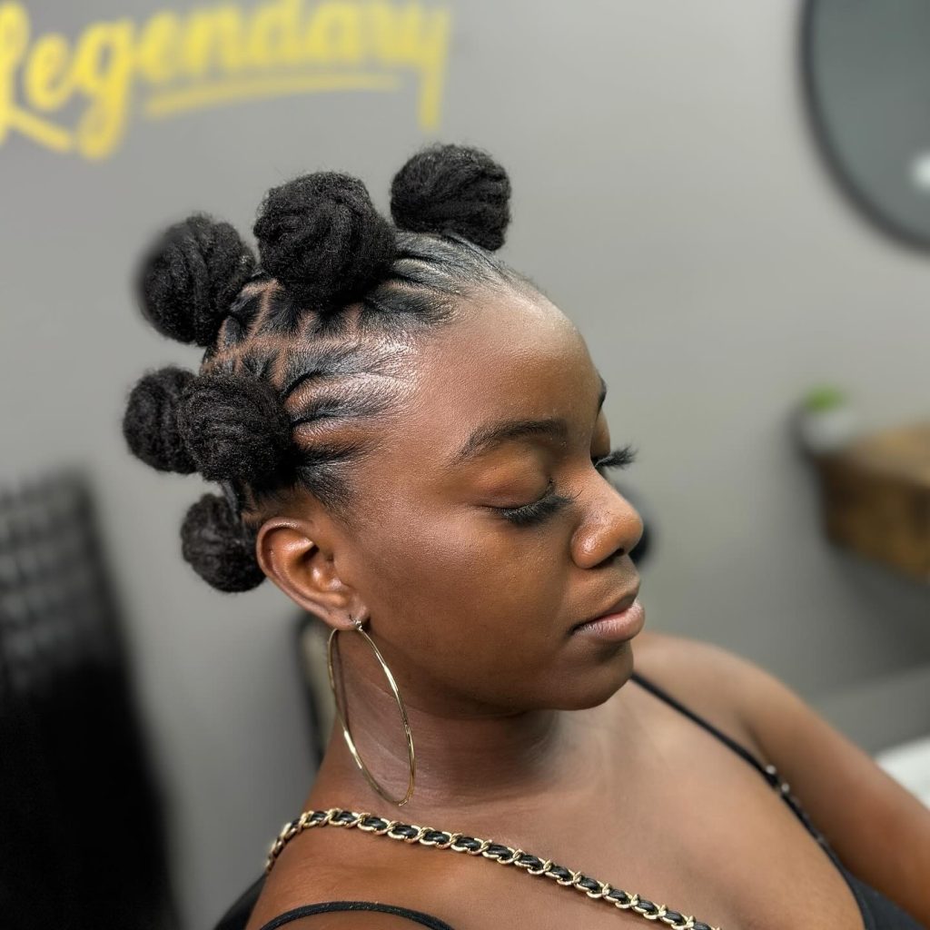 Pairing bantu knots with all-back cornrows is a striking combination that’s perfect for those who love bold, textured hairstyles. The bantu knots add volume and dimension, while the cornrows give a smooth, structured base.