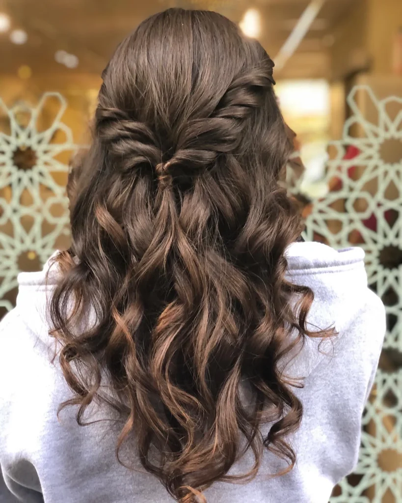 Similar to a braided crown but uses twisted sections of hair instead. It’s a softer, quicker, and more romantic alternative to braiding.
