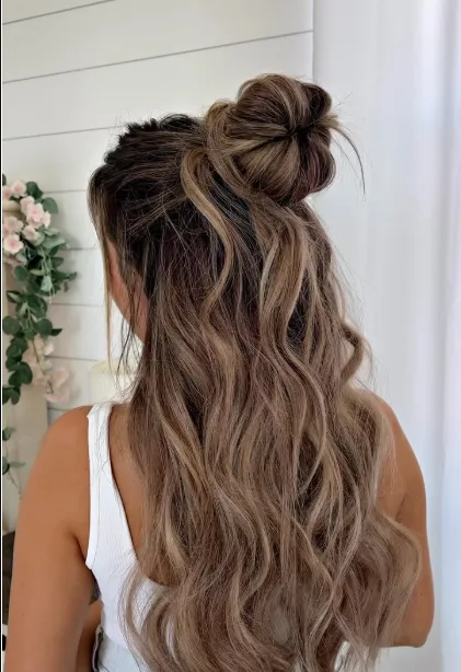 Naturally curly or coily hair gathered loosely into a high ponytail or “puff” on top of the head. This allows the curls to cascade down and celebrates natural texture.