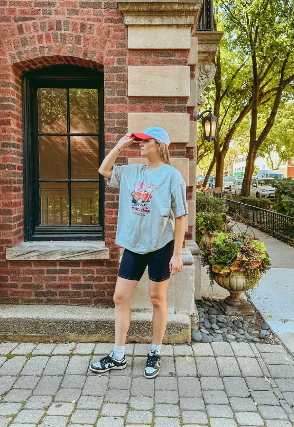 An oversized baseball-themed tee with sleek biker shorts gives off major off-duty model vibes. Add chunky sneakers, crew socks, and retro sunglasses to complete the look.