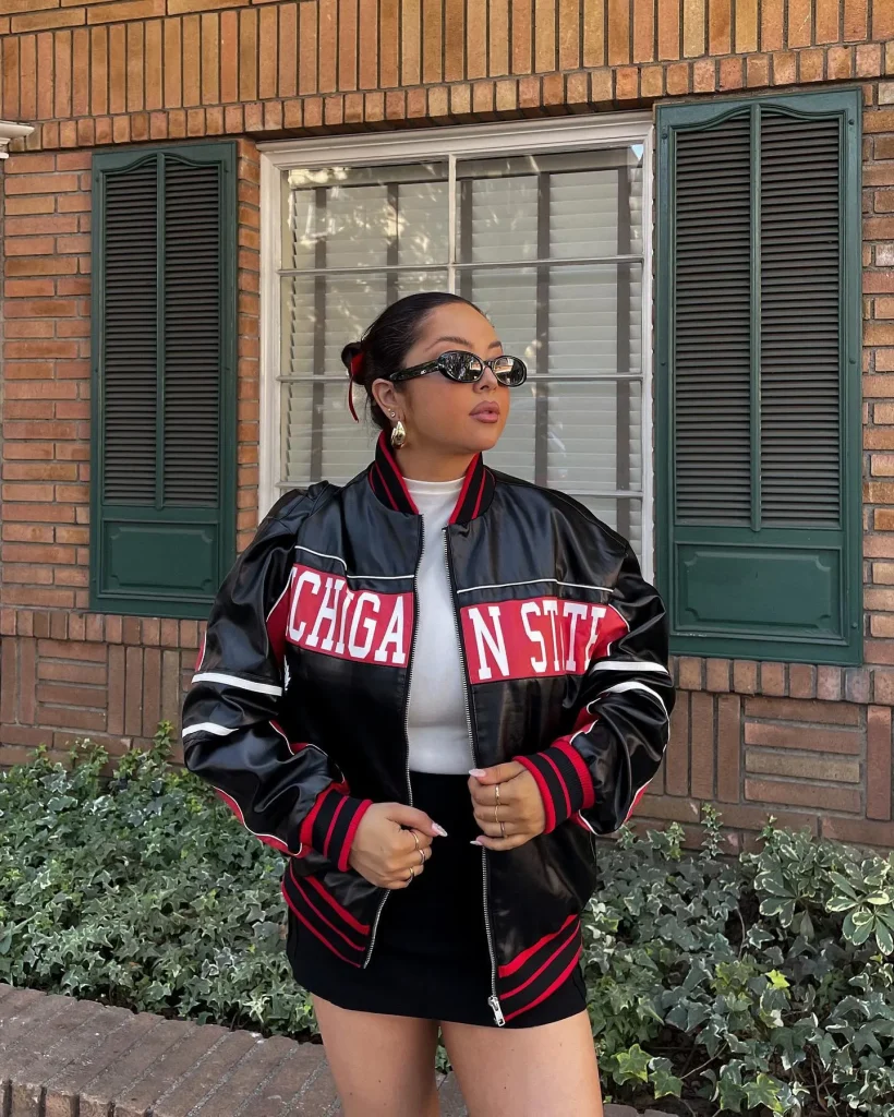 A cropped baseball-style bomber jacket layered over a fitted mini skirt is the perfect blend of sporty and trendy. Complete the look with knee-high socks and chunky sneakers.