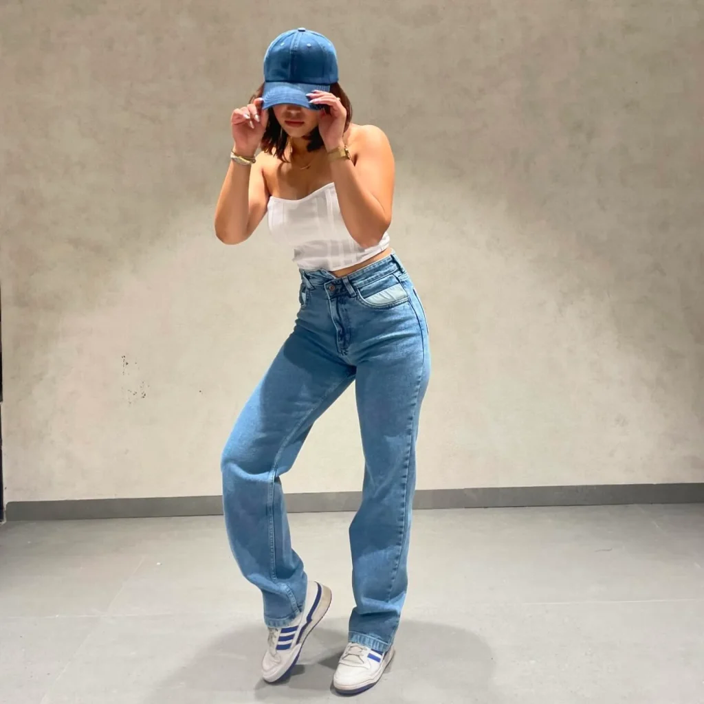 A cropped tank top with your team’s logo paired with high-waisted straight-leg jeans creates a casual yet stylish look.
