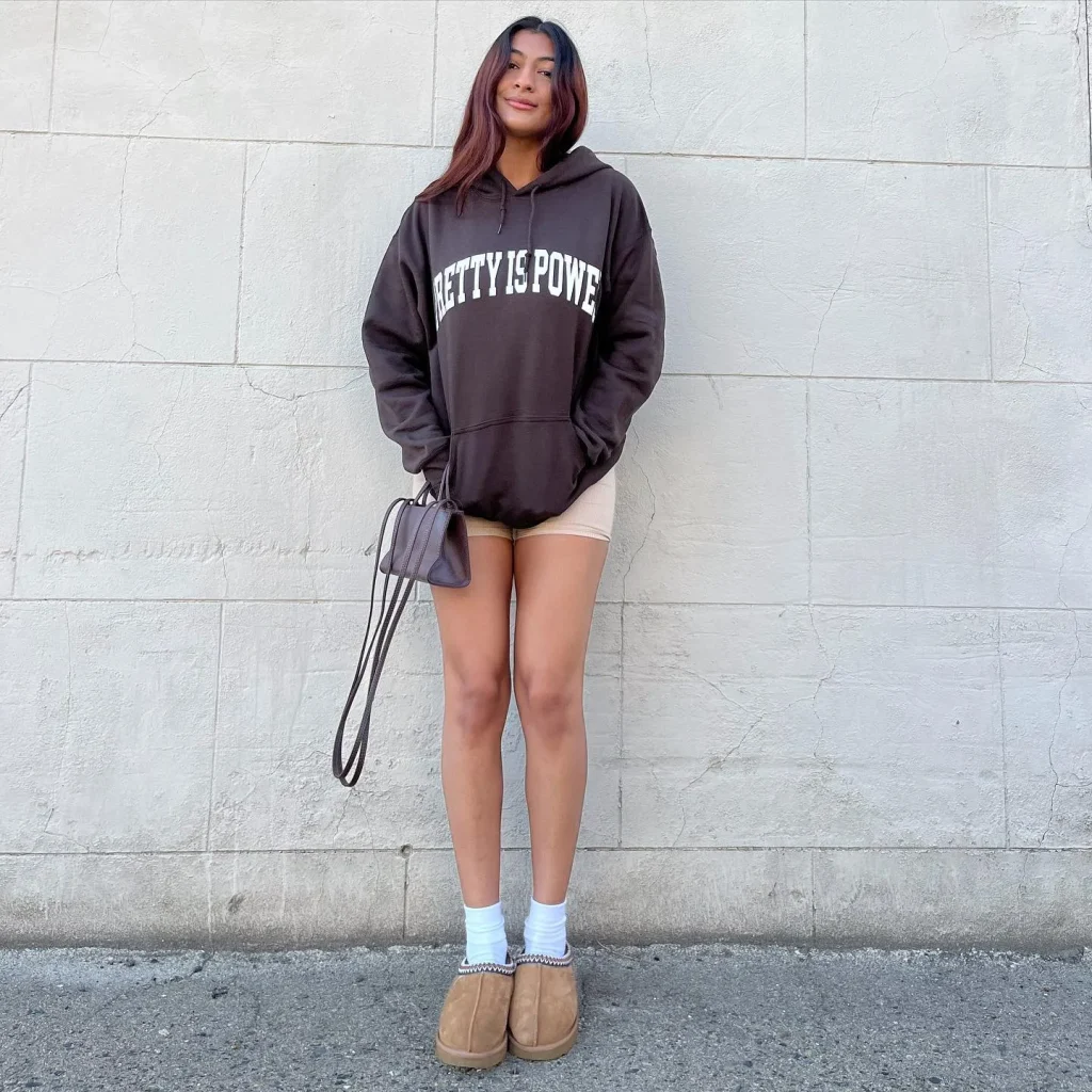 An oversized hoodie paired with biker shorts is the ultimate mix of cozy and stylish. Add knee-high socks and trendy sneakers to complete the look.