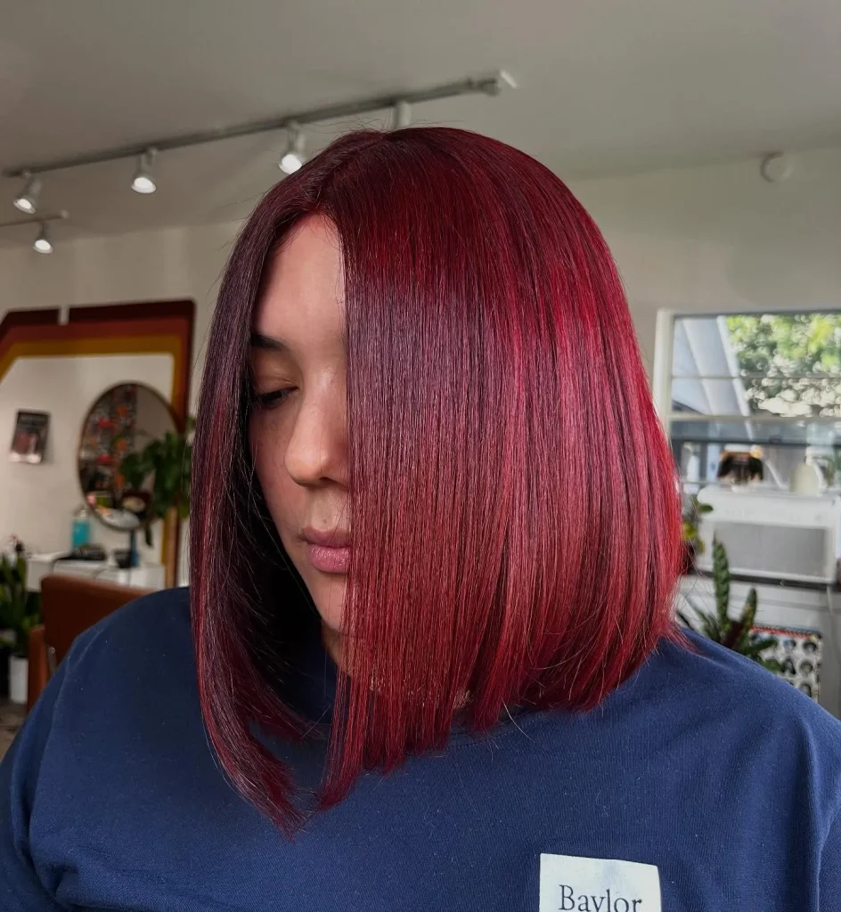 Want a red hairstyle that’s both sophisticated and trendy? The sleek bob with a bold red hue is a must-try. This hairstyle is sharp, sleek, and oozes confidence.