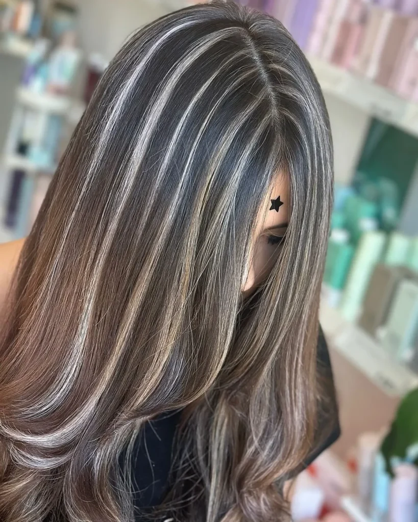 For the boldest of brunettes, icy blonde streaks create a striking, high-fashion contrast. This look is all about drama and confidence perfect for those who love standing out in the best way possible.