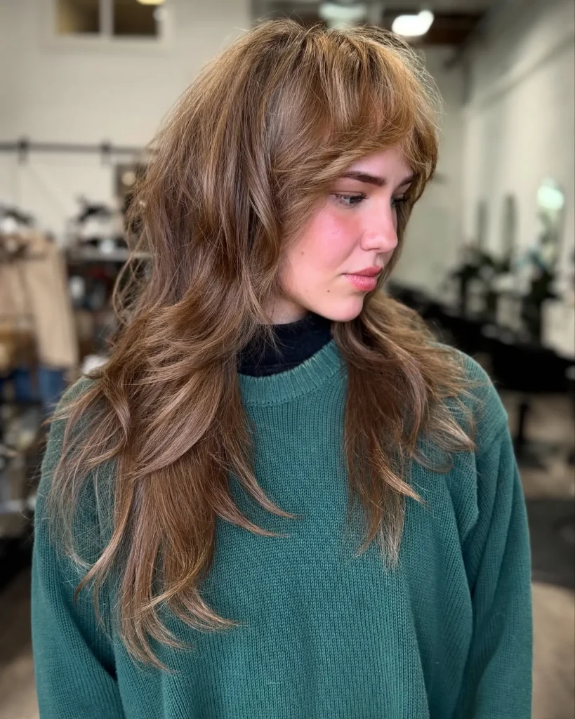 3. Curtain Bangs + Mid-Length Layers