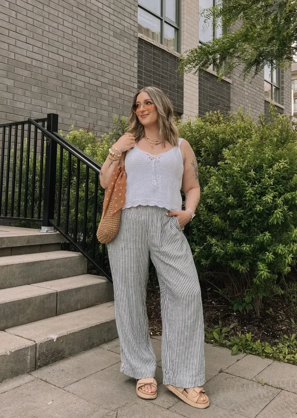 The contrast of delicate crochet with the structure of wide-leg linen trousers is chef’s kiss. It gives you that “I just got back from Ibiza” energy even if you’re just at brunch.