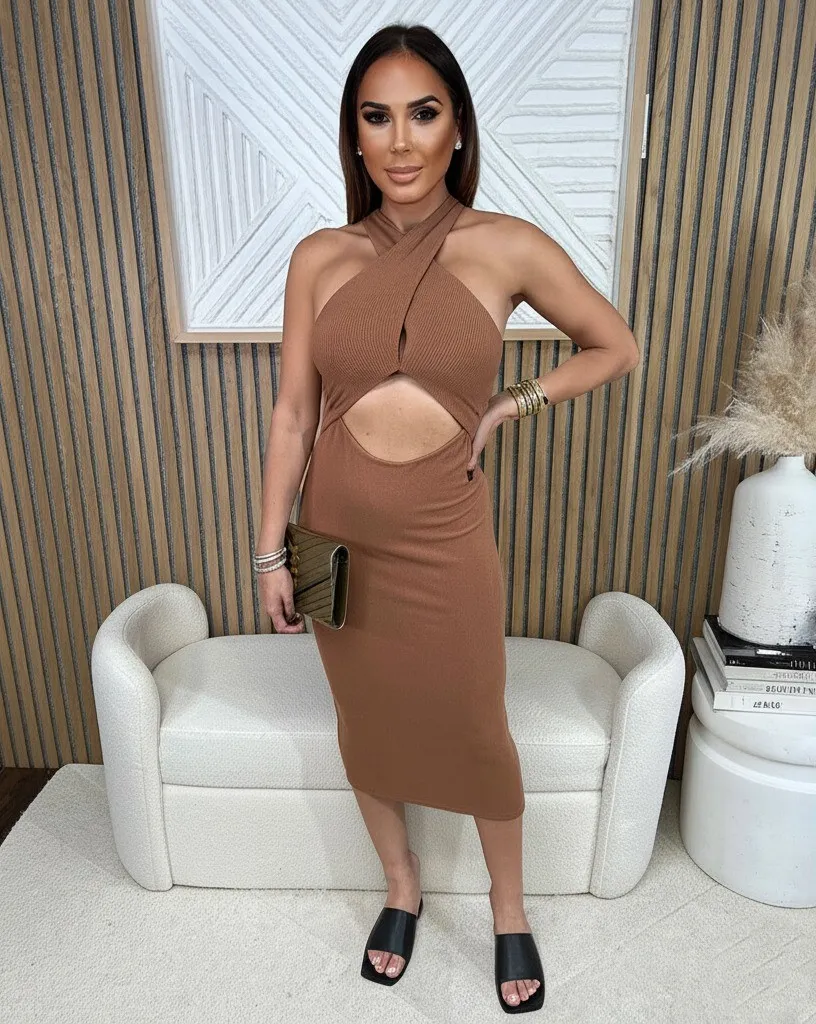 Strategic cut-outs let your body breathe and show off your tan without going full bare. Choose a cut-out dress in a midi length for balance.