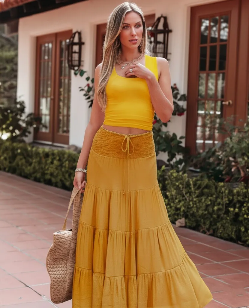 A matching set always looks elevated, but it’s also super convenient. A flowy maxi skirt with a coordinating bra top makes you feel like a walking breeze.