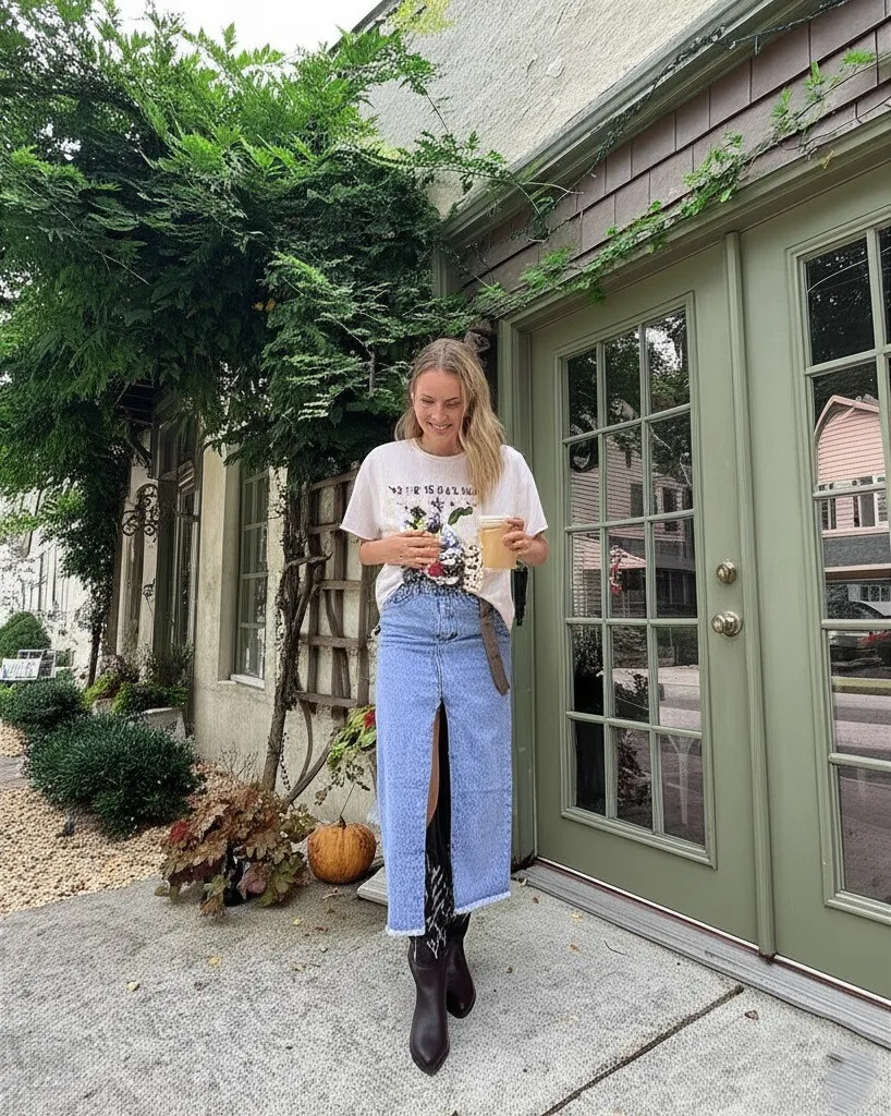 There’s something so cool about a vintage-style baby tee paired with a floor-grazing denim skirt. It hits the nostalgia sweet spot.