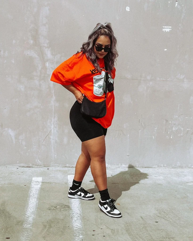 This is the outfit you throw on without thinking but still look cool. Oversized graphic tees and black biker shorts are a Gen Z staple for a reason they just work.