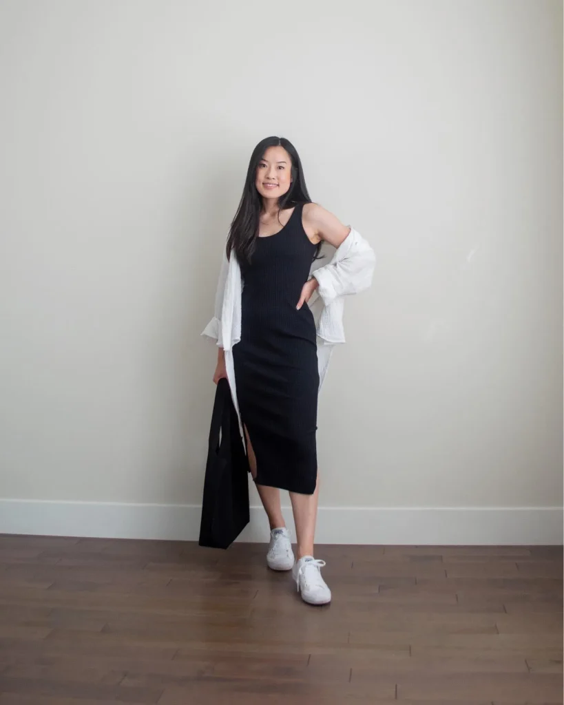 24. Ribbed Tank Dress + Button-Up Shirt + Dad Sneakers
