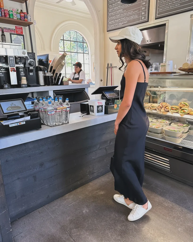 The slip dress is that one-piece wonder that never fails. Throw on white sneakers and a baseball cap to add casual contrast to the silky texture.