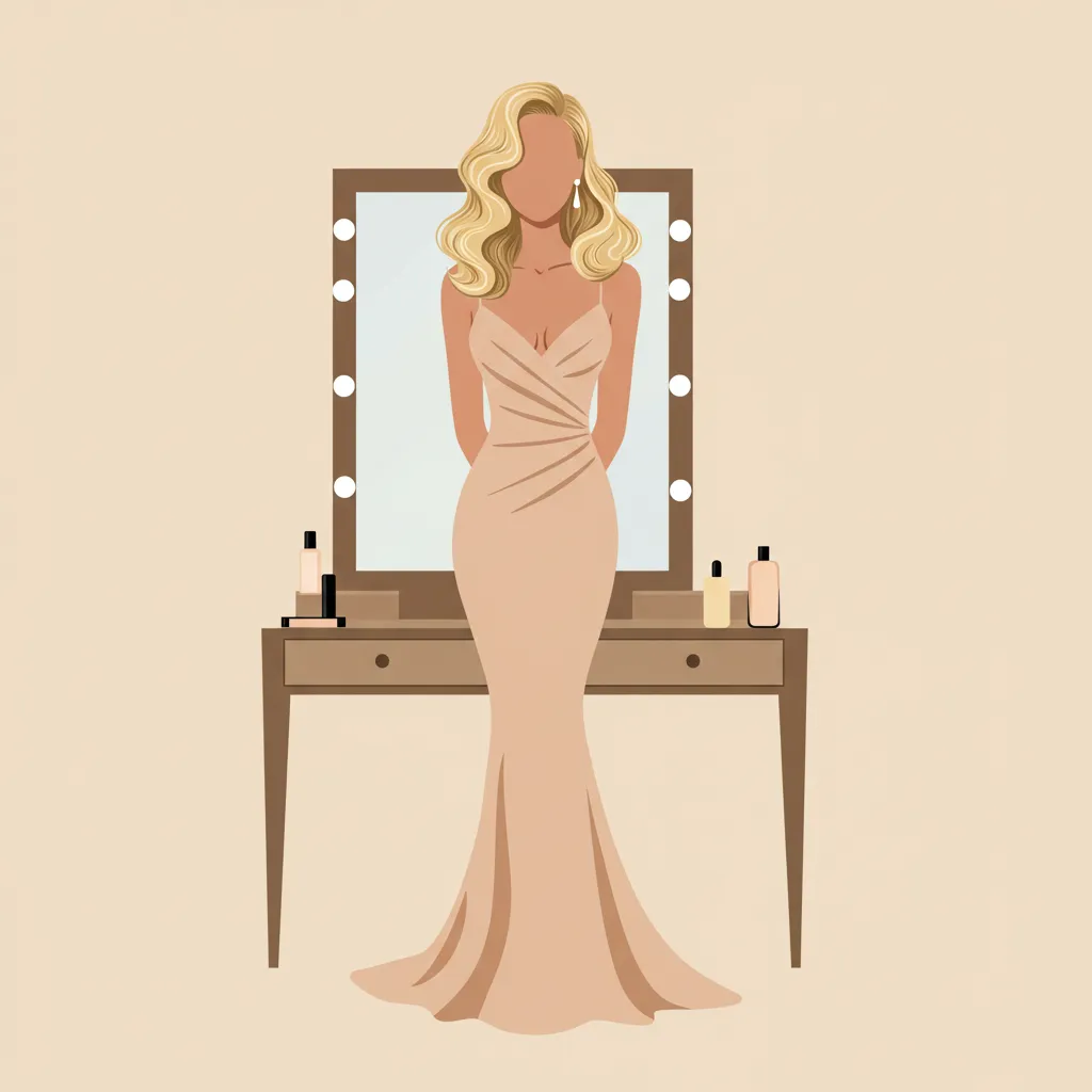The overall aesthetic is one of refined glamour and sophisticated femininity.