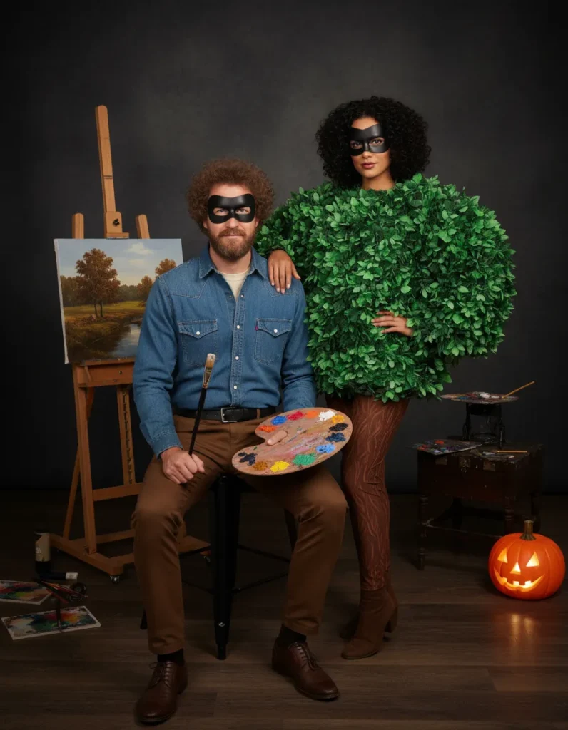 - The Blueprint: For Bob Ross: A light blue button down shirt and classic denim. The key components are the large curly wig, beard, and painter’s palette prop. For the Tree: A brown base outfit with a green top layer decorated with artificial leaves.