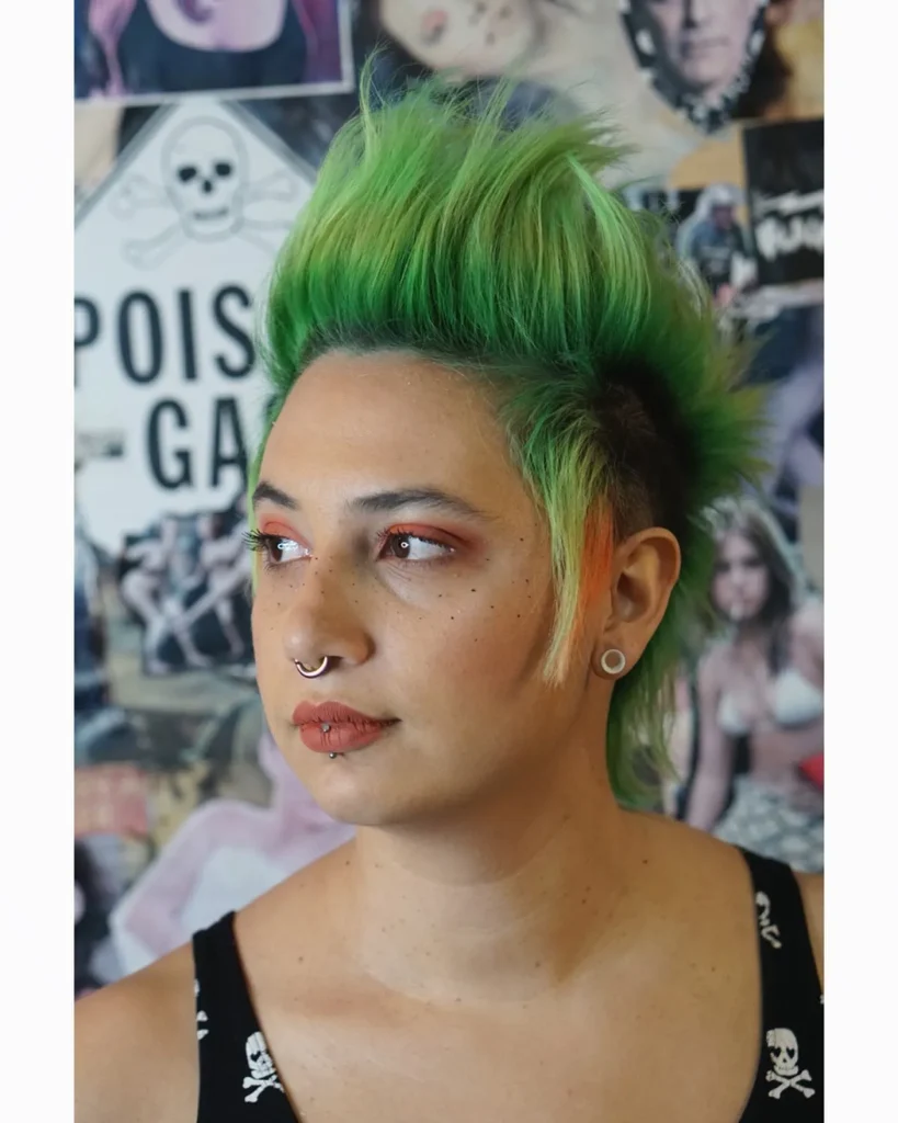 Hair is brushed tightly back from the face, saturated in vibrant, multicolored hair gel.