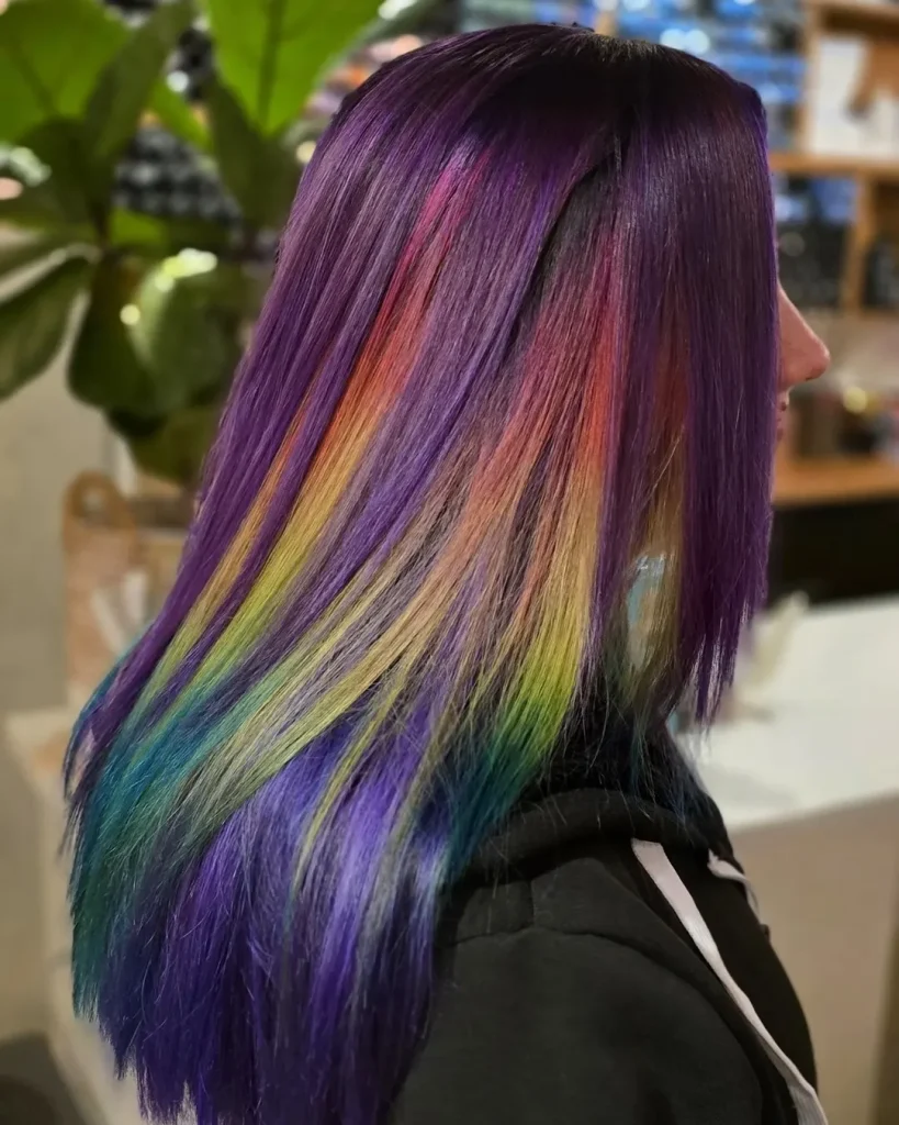 The majority of the hair remains natural, but one thick section (like a deep side bang or the underside layer) is saturated in one blindingly bright shade, like electric yellow or hot pink.