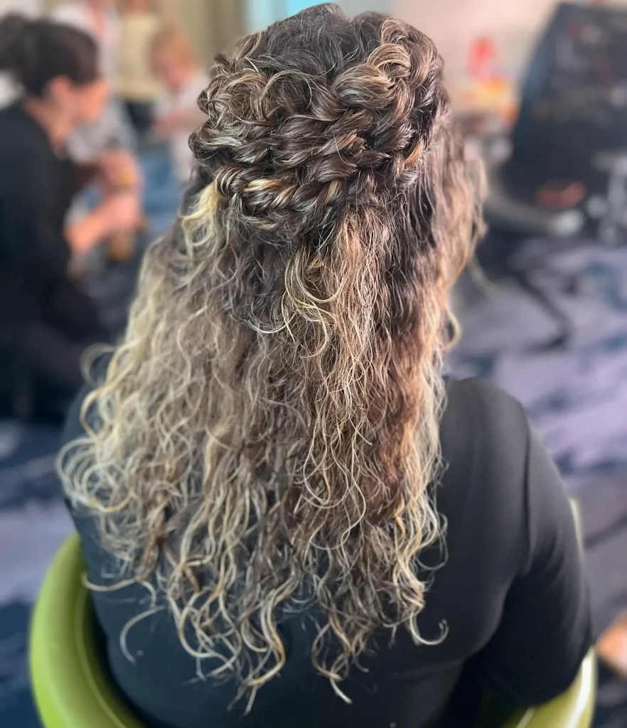 A curly braided crown adds an elegant, fairy-tale-like charm to your hair. Braid your curls along the crown of your head, leaving the rest of your hair free-flowing for a whimsical look.