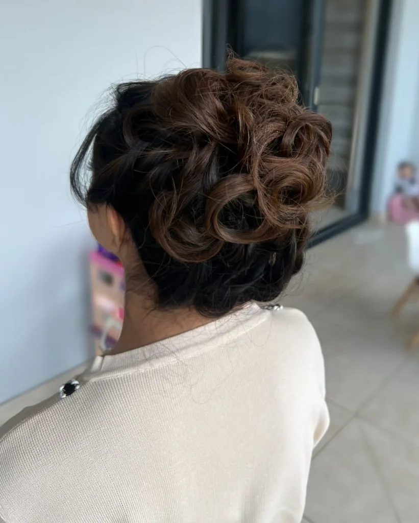 A messy curly updo is ideal for a more relaxed, boho vibe. The curls are loosely pinned up for a soft and romantic look, perfect for weddings or date nights.