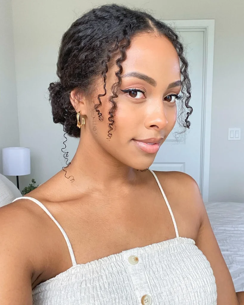 A curly top knot allows you to showcase your curls while keeping your hair out of your face. Itβs an easy and cute hairstyle that works for both casual and formal occasions.