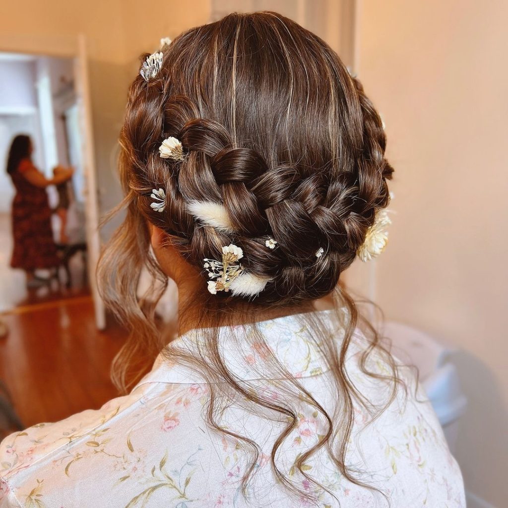A braided crown is a romantic and stylish way to keep your hair in place. Simply braid two sections of hair from either side of your head and pin them over the top to create a crown-like effect.