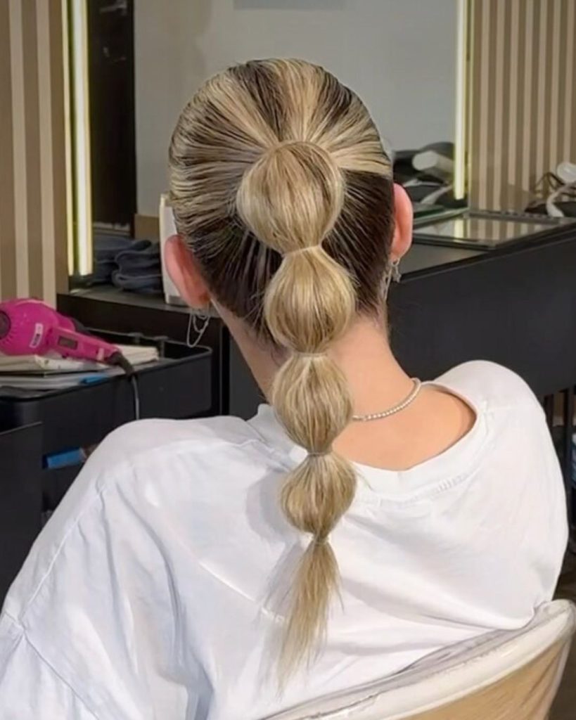 The bubble ponytail is a fun, trendy style that adds a bit of flair to your medium-length hair. It’s a playful look that’s easy to achieve.