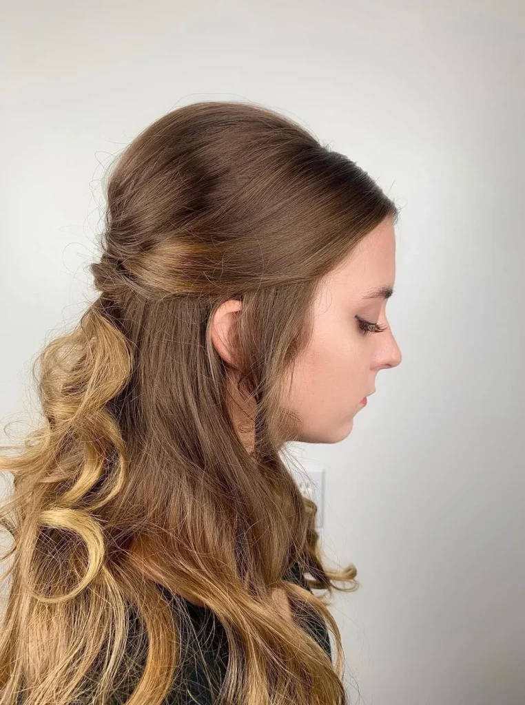 The half-up, half-down style is perfect for showing off both your hair’s length and texture. It’s a fun, versatile look for any occasion.