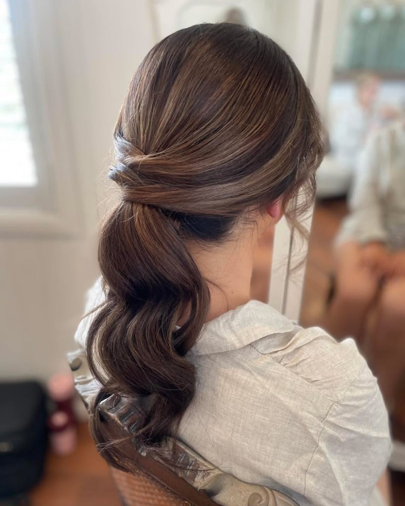 A low ponytail with a twist adds an elegant touch to a simple look. It’s ideal for both work and evenings out.